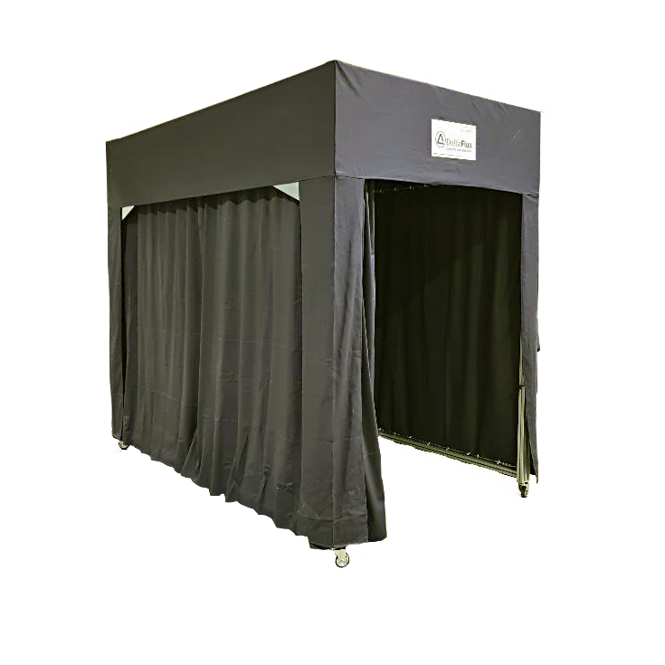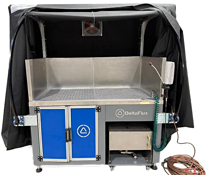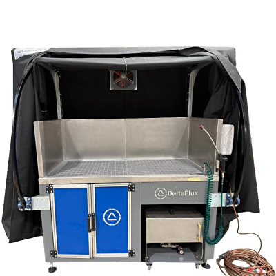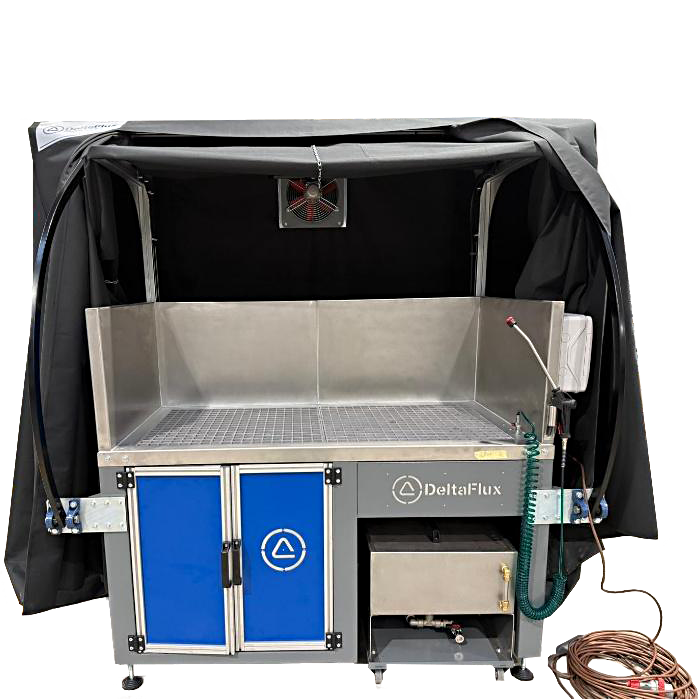 The DeltaFlux MPI Inspection Booth is designed to meet your specific magnetic particle or penetrant inspection requirements. Built to standard dimensions of 102 in x 90.5 in x 90.5 in (260 cm x 230 cm x 230 cm) L x W x H, the booth provides a controlled dark-room environment with integrated UV-A and white lighting systems for optimal inspection conditions.