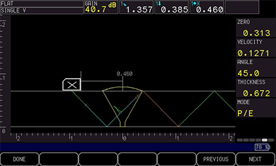 Displays all three leg components, angular distance, surface distance and depth (automatically displayed once an angle is entered) accounting for leg correction to correct for beam index point of wedge, fourth measurement box is gate 1 amplitude |